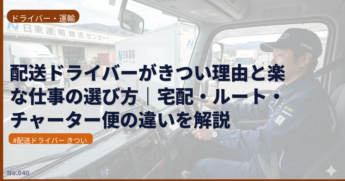 この記事では、配送ドライバーがきつい理由を身体的・精神的・労働環境の3つの観点から15個に分類して解説します。さらに職種別のきつさの違い、それでも続ける理由、向いている人の特徴、きつさを乗り越えるコツまで詳しく紹介します。