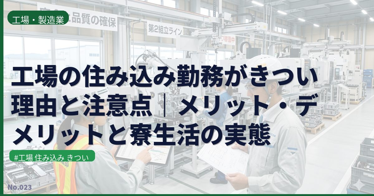 「工場の住み込みって本当にきついの?」——これから期間工や住み込み工場求人に応募しようとしている人の多くが抱く疑問です。住み込み(寮付き)の工場求人は、「家賃・光熱費ゼロ」「入寮一時金あり」「未経験歓迎」など、一見メリットだらけに見えます。一方で「人間関係から逃げられない」「プライバシーがない」「単調すぎて精神的にきつい」という声も後を絶ちません。実際のところ、工場の住み込み・寮生活はどこまできついのか。この記事では、そのリアルを包み隠さず解説します。
