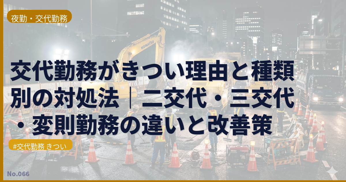 この記事では、交代勤務がきつい理由を15個、体・心・生活・職場の4つの角度から詳しく解説します。あわせて、交代勤務を続けながらでも少しでも楽に乗り越えるための実践的な対策と、将来的なキャリアの選択肢もご紹介します。